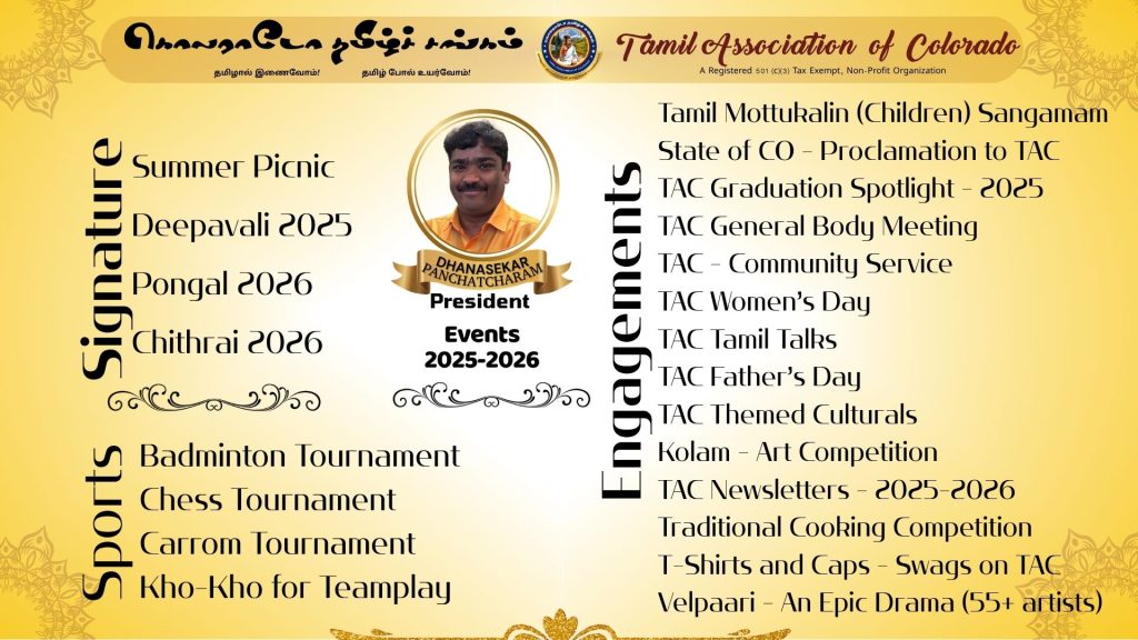 Home கொலராடோ தமிழ்ச் சங்கம்Tamil Association of Colorado "A Registered 501(c)(3) Tax-exempt, Non-Profit Organization" தமிழால் இணைவோம்! தமிழ் போல் உயர்வோம்! அகர முதல எழுத்தெல்லாம் ஆதிபகவன் முதற்றே உலகு TAC YouTube Channel YouTube Video UCACUpgIzmxTrPyHT7Dn_gRQ_NGI5khkUWLA Events 2025-2026